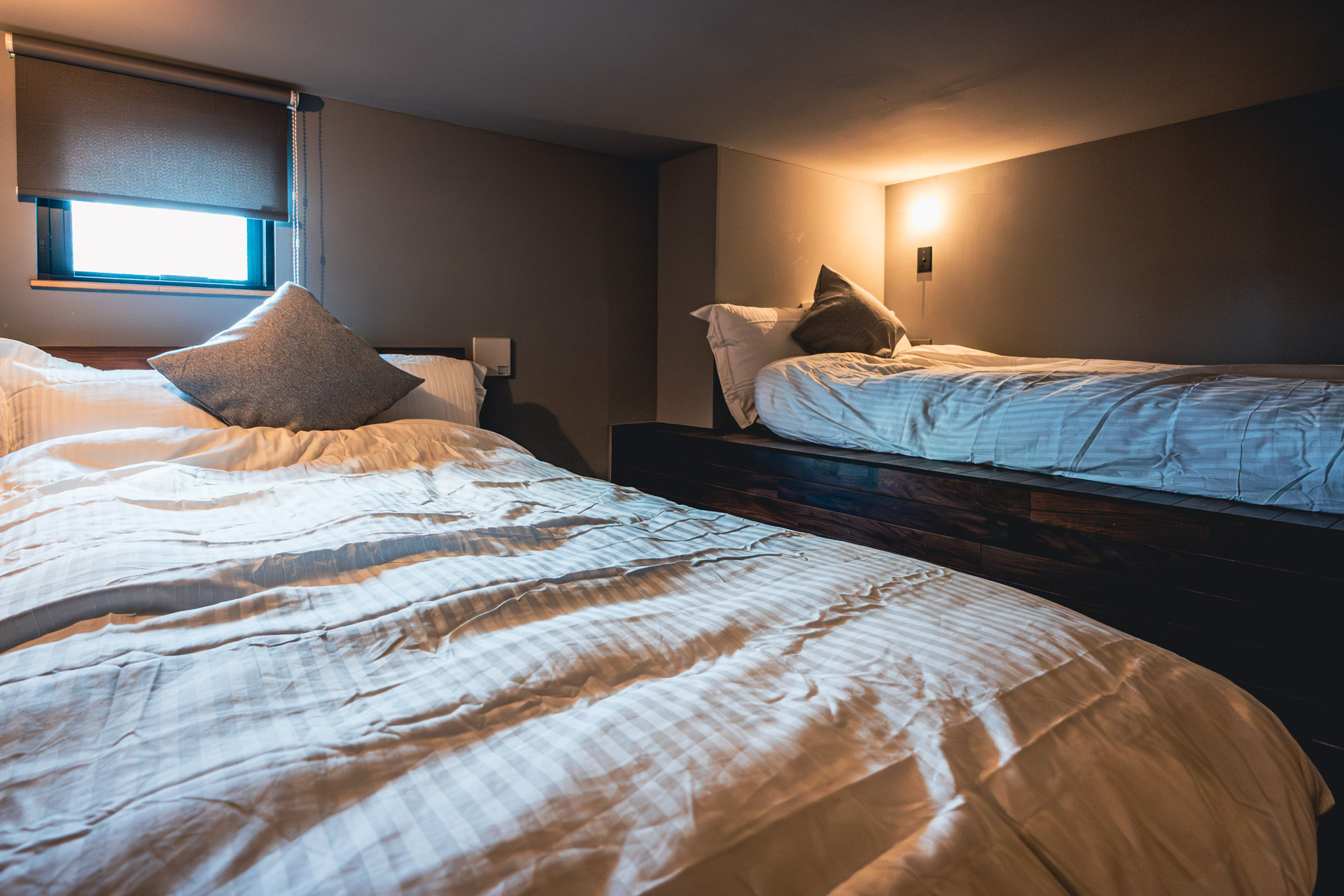 もう1部屋は、広々としたベッドルームになっております。カップル、ファミリーでお休みいただくもよし、お一人でお使いいただくもよし、旅の疲れを癒してください。